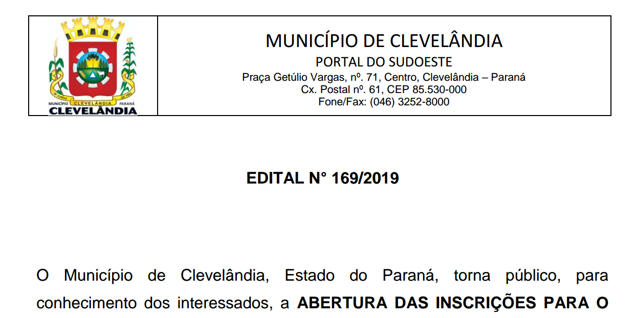 O Município de Clevelândia, Estado do Paraná, torna público, para conhecimento dos interessados, a ABERTURA DAS INSCRIÇÕES PARA O PROCESSO SELETIVO PÚBLICO SIMPLIFICADO – EDITAL N° 169/2019. Link Para Inscrição: https://backup.famapr.edu.br/pss/