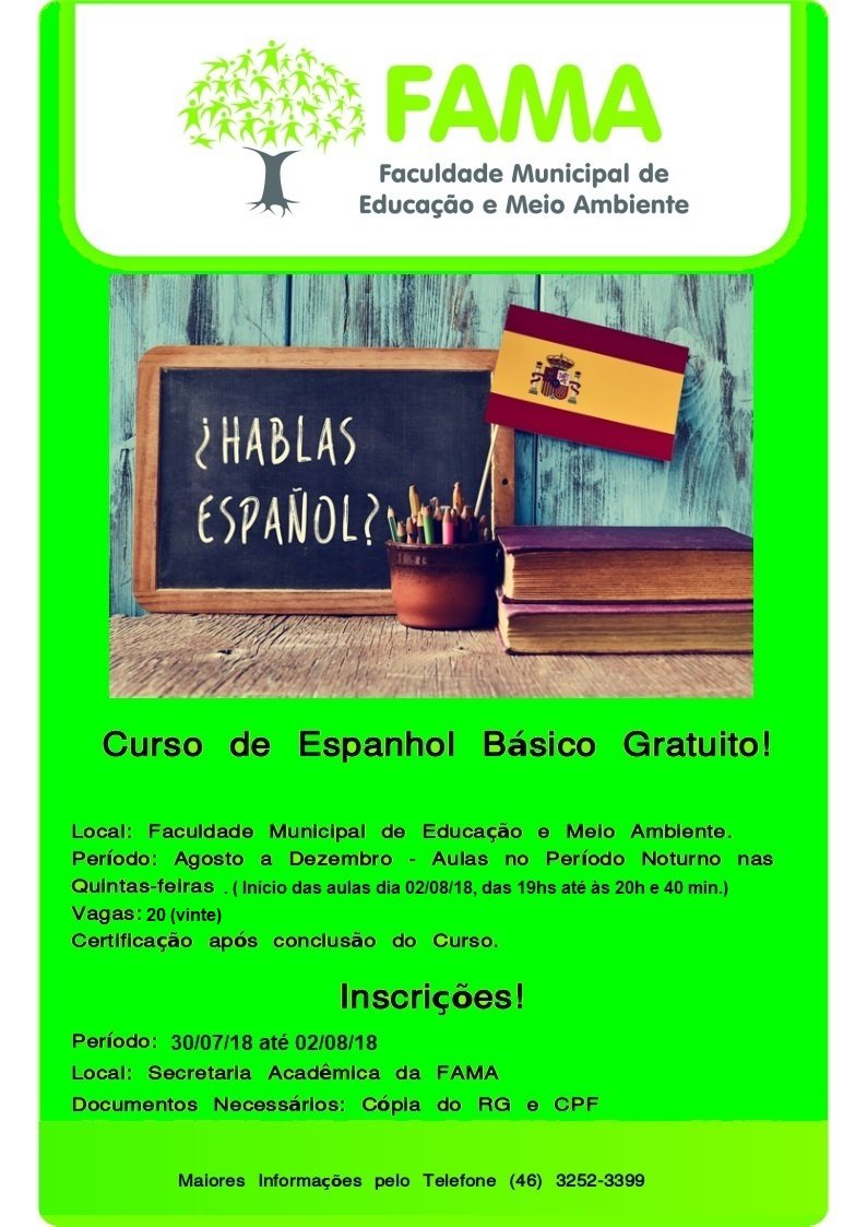 A Faculdade Municipal de Educação e Meio Ambiente – FAMA, ofertará Curso de Espanhol Básico Gratuito, as inscrições ocorrerão do dia 30/07/2018 até dia 02/08/2018. O curso será oferecido no período de Agosto a Dezembro de 2018, com […]