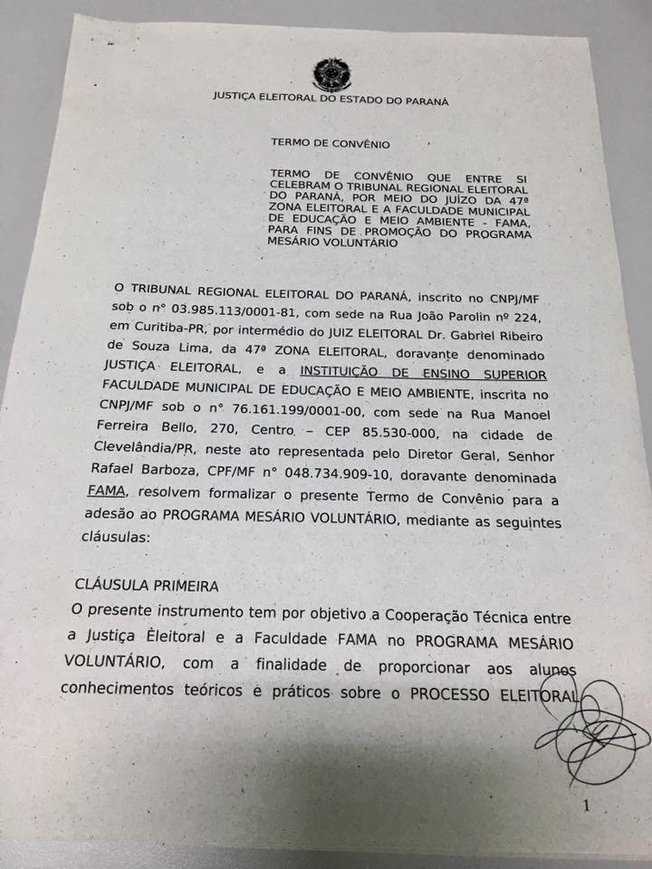 Com objetivo de atender ao Programa Mesário Voluntário, a FAMA e o Tribunal Regional Eleitoral firmaram convênio, com a finalidade de proporcionar aos acadêmicos conhecimentos teóricos e práticos sobre o processo eleitoral brasileiro, bem como maximizar recursos humanos no âmbito da justiça Eleitoral do Paraná. Maiores informações serão tratadas no mês de julho, onde se estabelecerá a demanda necessária para atender ao programa.