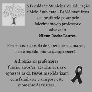 A Faculdade Municipal de Educação e Meio Ambiente – FAMA manifesta seu profundo pesar pelo falecimento do professor e advogado Nilton Rocha Loures.