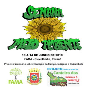 A Faculdade de Educação e Maio Ambiente de Clevelândia tem o prazer de convidar toda a comunidade acadêmica para nossa SEMANA DO MEIO AMBIENTE 2019 – FAMA, que acontecerá no Auditório do Colégio João XXIII entre os dias 11 e 14 de Junho. Na ocasião receberemos lideranças comunitárias da região, pesquisadores e alunos de outras instituições para, durante esses 4 dias, aprofundarmos temas relativos à questão ambiental, como a Proteção das Águas, criação de Abelhas sem Ferrão, situação das Mulheres do Campo, Educação do Campo, Indígena e Quilombola, entre outros assuntos em discussão na atualidade. Teremos diversas atividades como Oficinas, Mesa Redonda, Seminários e Cinedebate.